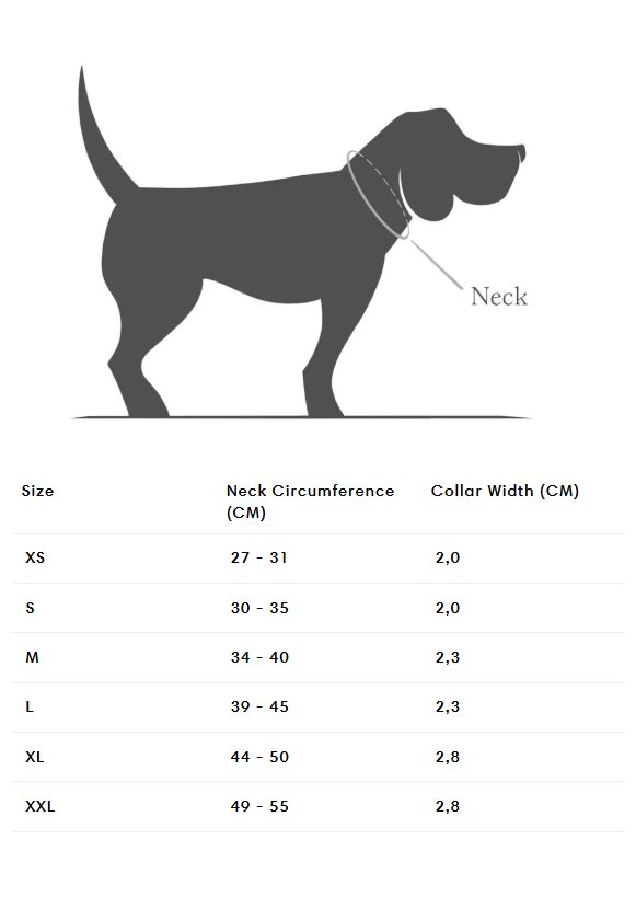 ⚠ Upozornění: Vzhledem k vlastnostem přírodní pletené kůže může obojek mírně povolit. Pokud je váš pejsek mezi dvěma velikostmi, doporučujeme zvolit tu menší.