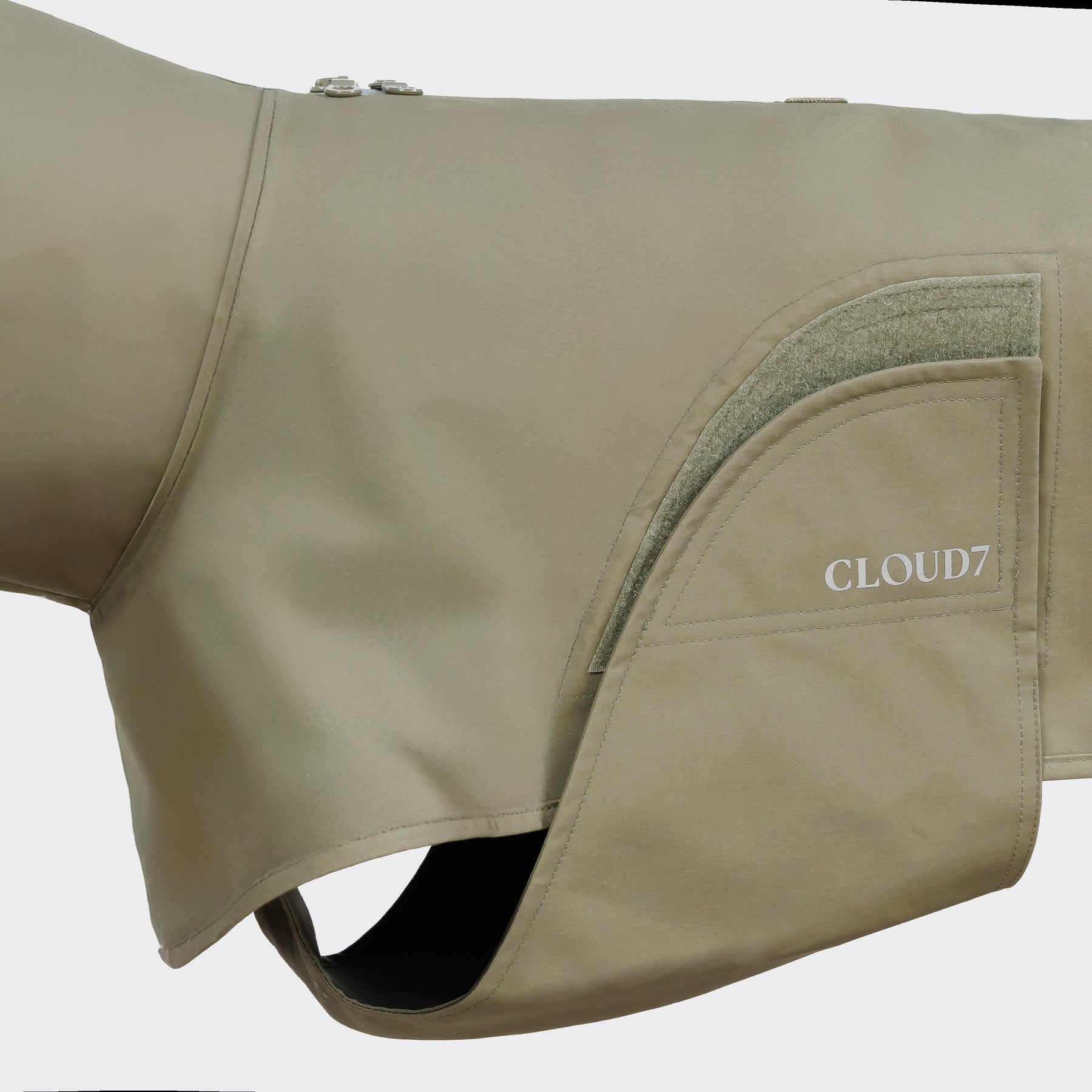 Pláštěnka je prodyšná, má podlepené švy, bouřkový límec a větrací otvory, které zajišťují pohodlí i při pohybu. Dlouhý dvoucestný zip umožňuje snadný přístup k obojku nebo postroji. Zadní část je vybavena nastavitelnou gumičkou a popruhy na zadní nohy, které udrží pláštěnku na místě i při běhu a hrách.