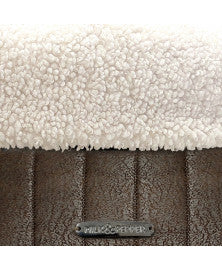 Stylový, hebký a výjimečně útulný pelíšek pro psy od značky Milk & Pepper, který kombinuje sametově měkký povrch v hnědém „vintage“ semišovém vzhledu s vnitřní stranou z načechraného krémového kožíšku ve stylu ovčí vlny.